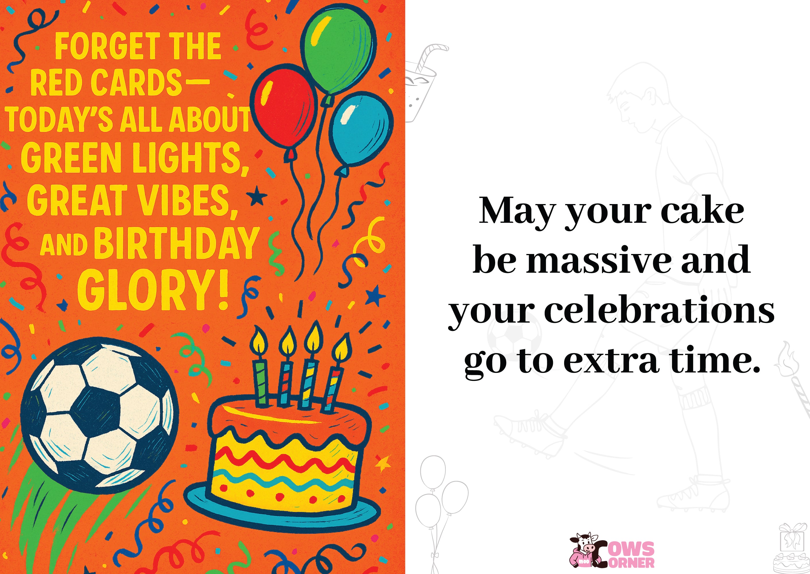 This football themed birthday card brings that electric stadium energy directly to the letterbox of your favourite fan. At Cows Corner, we know that birthdays are the ultimate cup finals of the year, and they deserve more than a generic supermarket find. We designed this card for the supporters who spend their weekends debating VAR decisions or lunging into tackles at five a side. It features a bold message reminding the birthday legend that today is all about green lights, great vibes, and pure birthday glory. When you buy this card, you are choosing a piece of British design that speaks the language of the terraces rather than corporate fluff.