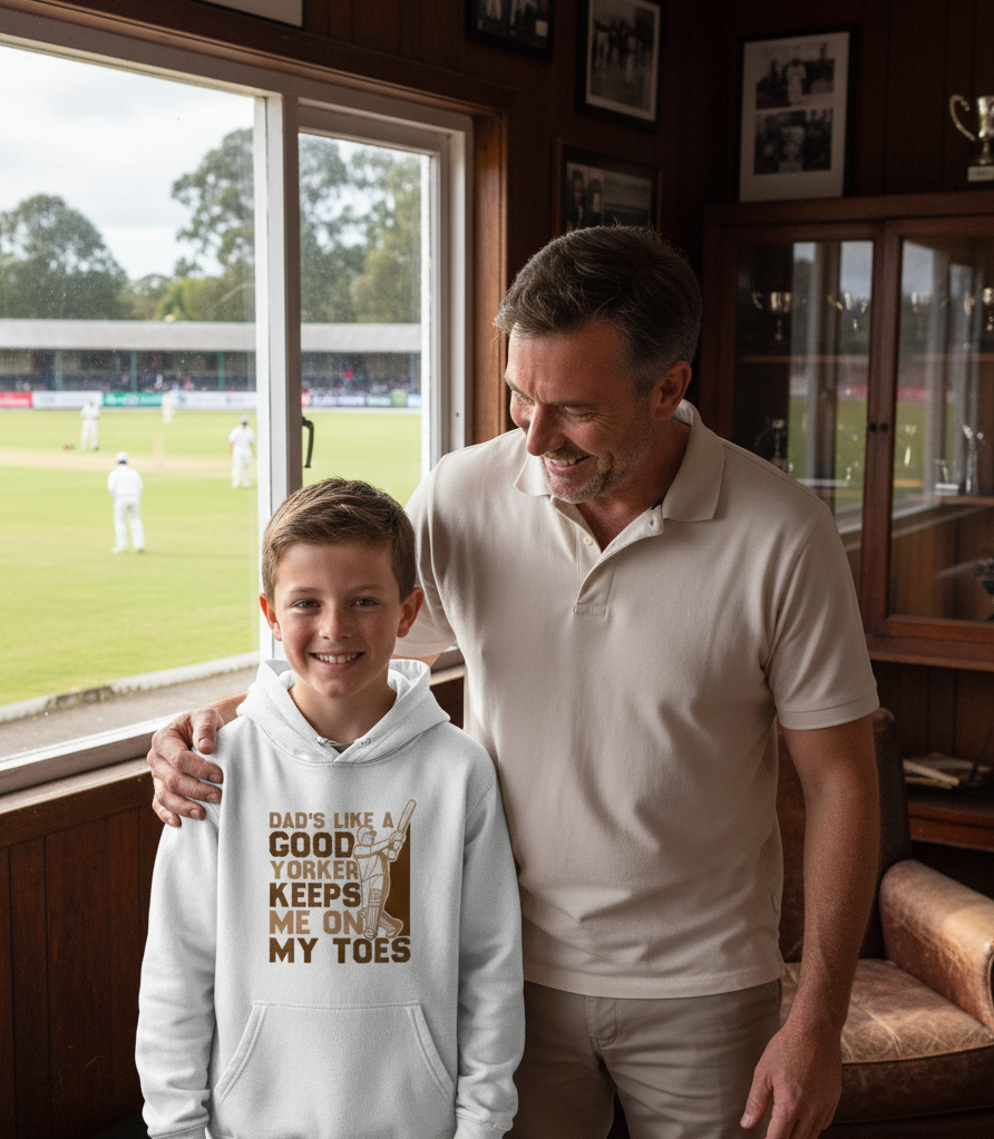 Featuring the witty phrase "Dad’s Like a Good Yorker, Keeps Me on My Toes", this hoodie is perfect for players, fans, and those who know the struggle of facing a perfect yorker, whether it’s on the pitch or in everyday life!