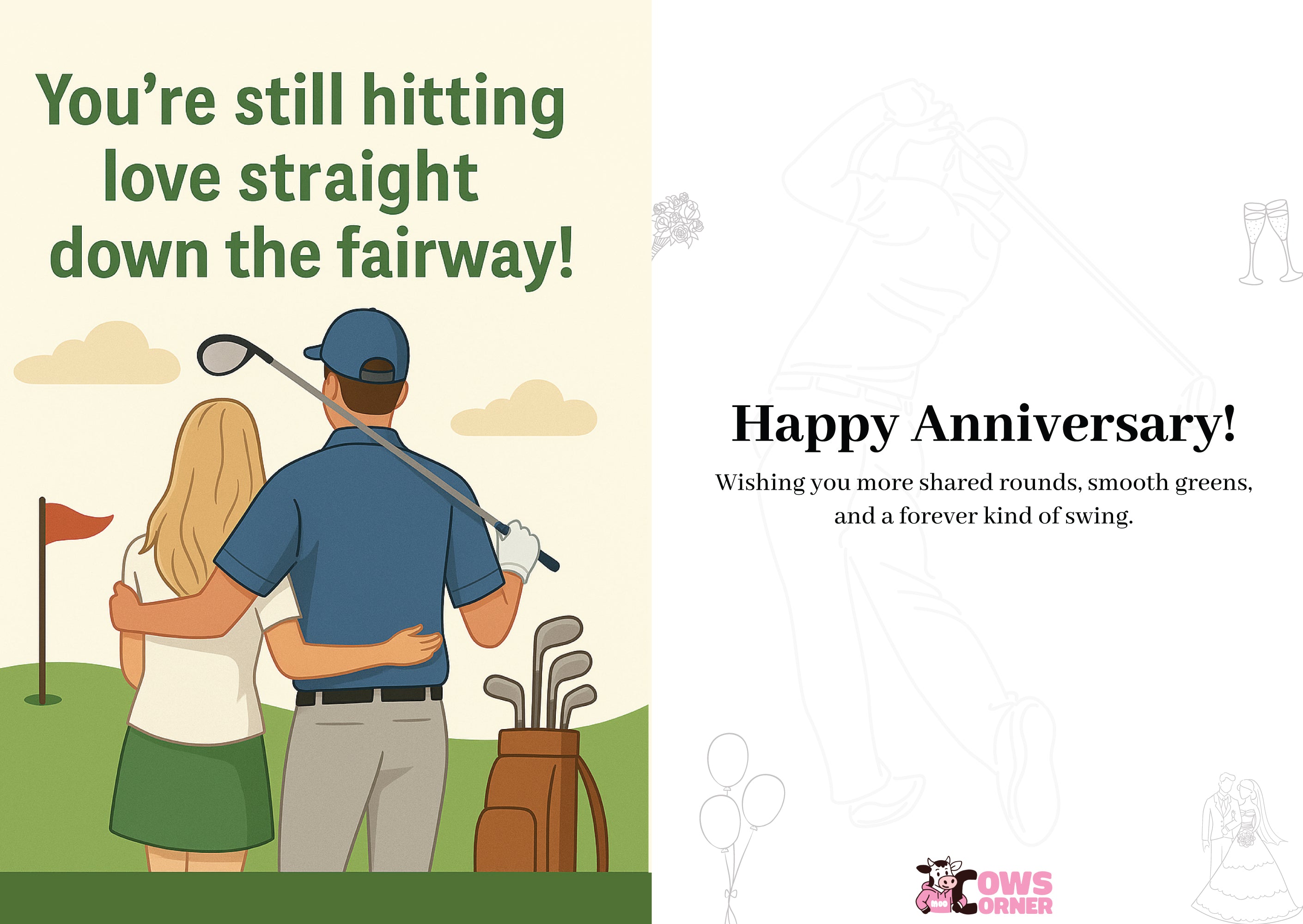 Our Golf Themed Wedding Anniversary Card is the ultimate winner for couples who spend their best days on the green. At Cows Corner we know that a long lasting marriage is much like a challenging eighteen holes because it requires patience, a bit of strategy, and the ability to laugh when things end up in the rough. This unique card celebrates that shared passion with a cheeky nod to their favourite pastime. Whether they are seasoned pros or high handicappers who just enjoy the walk, this design hits the mark perfectly. It is time to toast to another year of avoiding life’s bunkers and keeping the relationship on the right track. You can get yours today and ensure their special milestone feels like a hole in one.