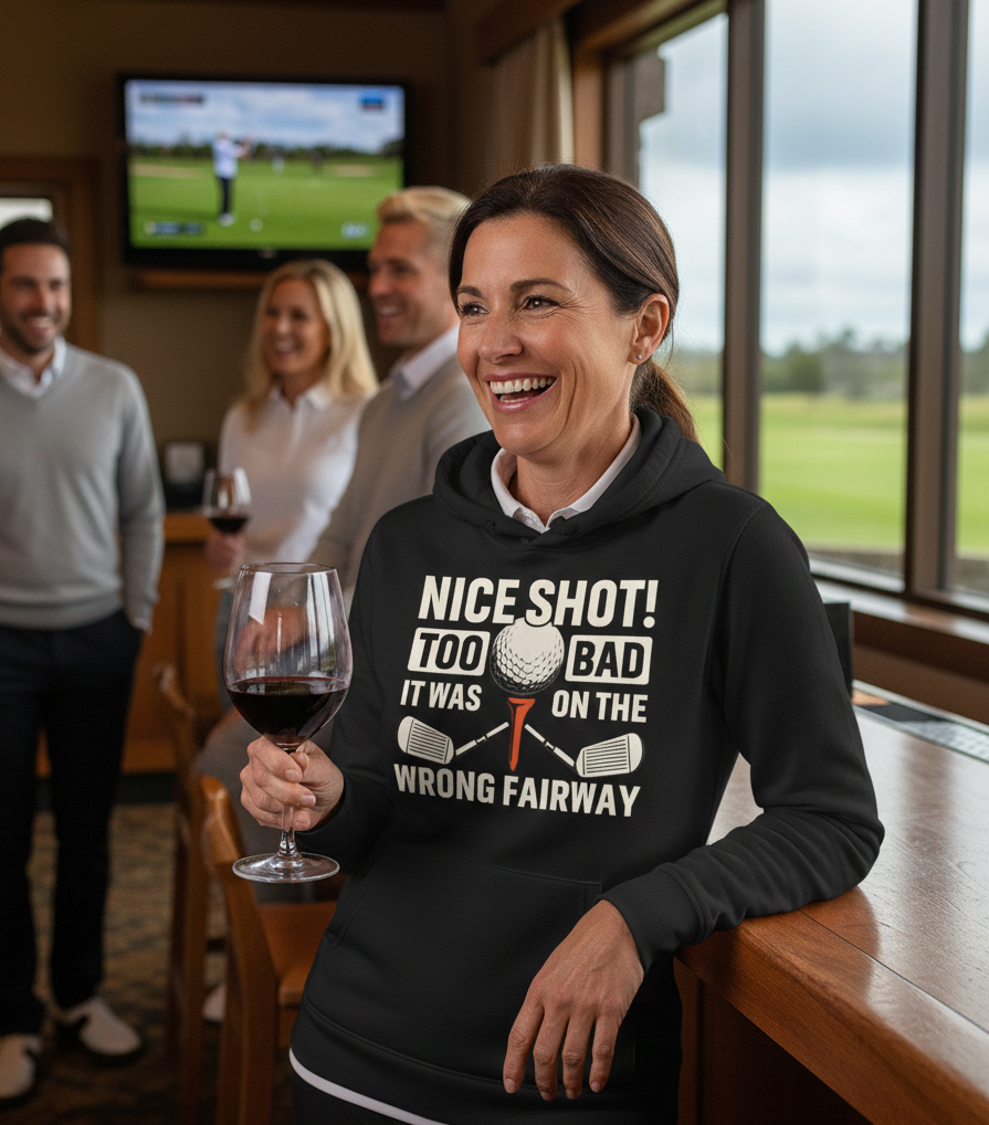 Looking for a hilarious gift that’ll have golf lovers laughing all the way to the clubhouse? This funny golf hoodie is a guaranteed winner. Featuring the brilliant line "Nice Shot! Too Bad It Was on the Wrong Fairway", it’s designed for golfers who enjoy the sport just as much as they enjoy the banter that comes with it.