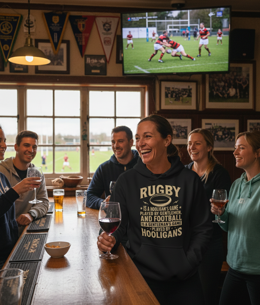 This funny rugby hoodie is the ultimate choice for anyone who loves rugby culture and the classic banter that comes with it. Featuring the witty slogan “Rugby Is a Hooligan’s Game Played by Gentleman, and Football Is a Gentleman’s Game Played by Hooligans,” this best-selling design is perfect for rugby fans who enjoy humour, tradition, and style. Available in timeless black, it offers both comfort and quality at an affordable price, making it a great value gift idea.