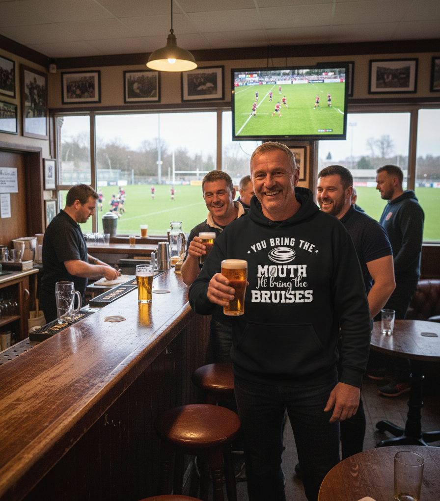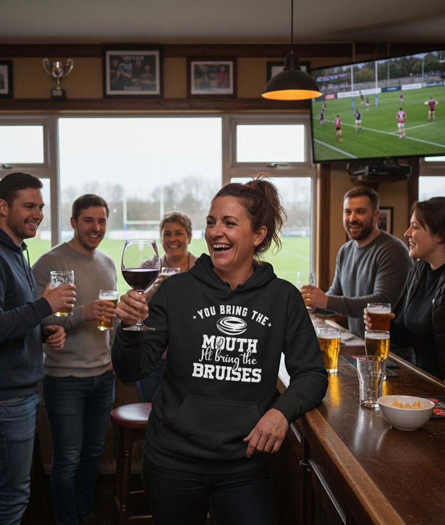 Looking for the perfect rugby gift that captures the humour, passion and banter of the sport? This funny rugby hoodie is the ideal choice. With its bold slogan “You Bring the Mouth I’ll Bring the Bruises” it delivers a statement piece that rugby players and fans alike will wear with pride. Available in classic black, this hoodie combines comfort, durability and style, making it a must-have for anyone who lives and breathes rugby culture.