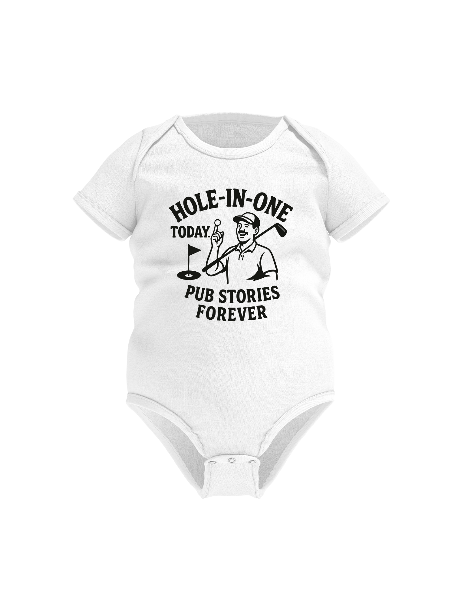 Funny golf hole in one baby grows are the perfect way to welcome a new arrival into a family that lives for the fairway. Designed with a cheeky nod to clubhouse humour, this playful baby grow reads “Hole-in-One Today, Pub Stories Forever” and brings together style, comfort, and laughs from the very first day. Whether Mum or Dad is obsessed with golf or the entire family can’t resist a post-round pint and story session, this baby grow adds a brilliant dose of personality to your little one’s wardrobe.