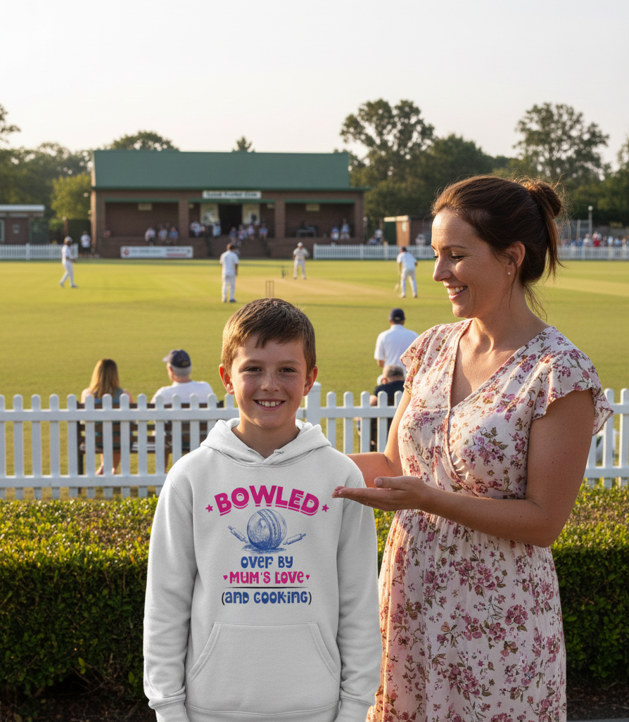 Looking for the perfect gift for a young cricketer? Our Bowled Over by Mum’s Love (and Cooking) hoodie is designed for kids who love cricket as much as they love mum’s home-cooked meals, even the veg!