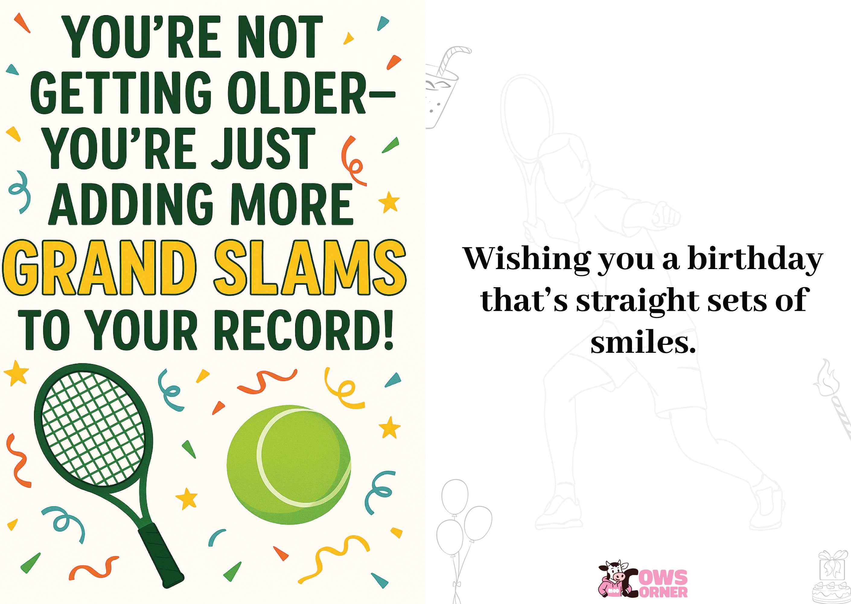 This tennis themed birthday card is currently in stock and ready to ship. Whether you're sending it direct or handing it over in person, it's sure to raise a smile. Buy online with secure checkout and enjoy a hassle-free experience from a trusted brand. Looking for more? Shop the full Cows Corner tennis collection for witty, original products made for sports lovers who don’t take themselves too seriously.